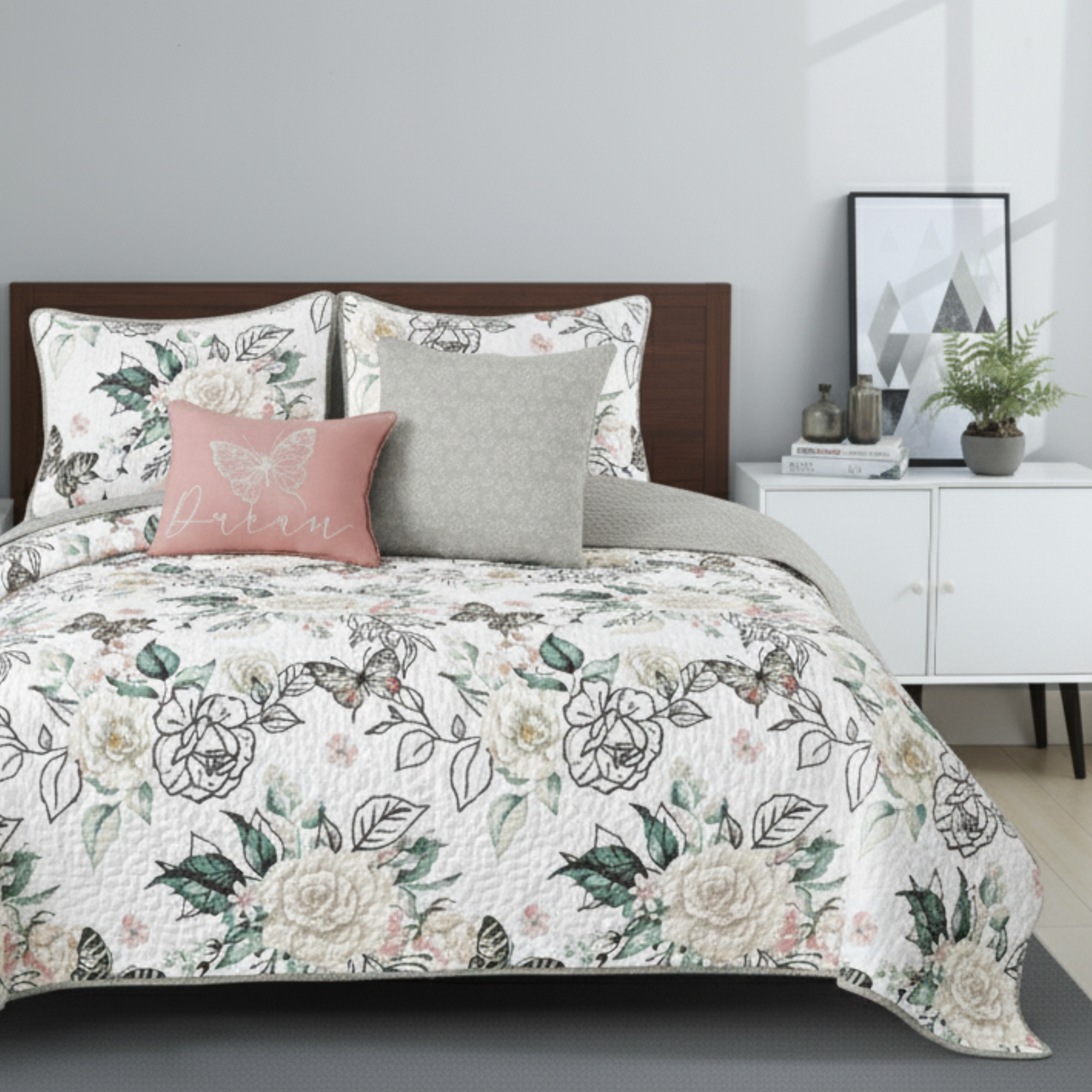Refresh your bedroom with the Quilt, featuring a stunning hand drawn design of roses and butterflies in soft watercolor hues. This lightweight, breathable quilt offers the perfect blend of modern romance and comfort for year-round use.