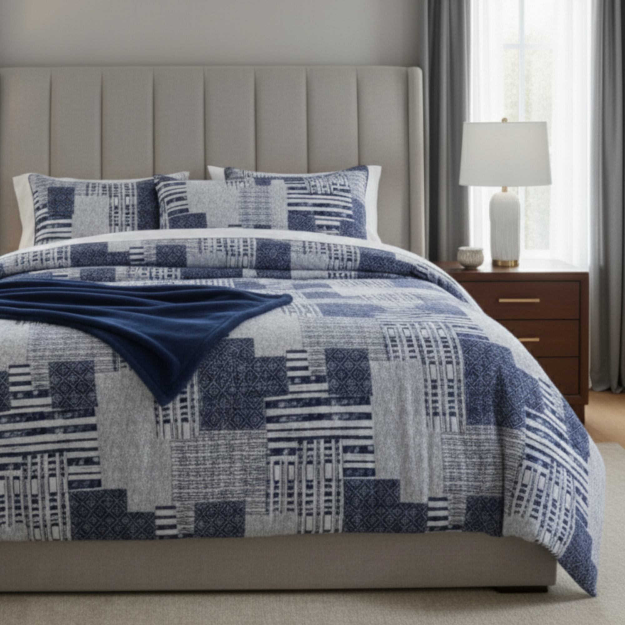 Transform your bedroom with this complete 5-piece comforter set, featuring a captivating modern geometric patchwork design in sophisticated tones (color-neutral description). The lightweight comforter provides cozy warmth while instantly becoming the focal point of your space. Designed for an elegant, layered look, the set includes one plush comforter, two King-sized pillow shams, and one complementary accent pillow. The luxurious ensemble is completed by a bonus plush throw blanket, perfect for adding an extra layer of warmth and texture, or draping artfully at the foot of the bed.