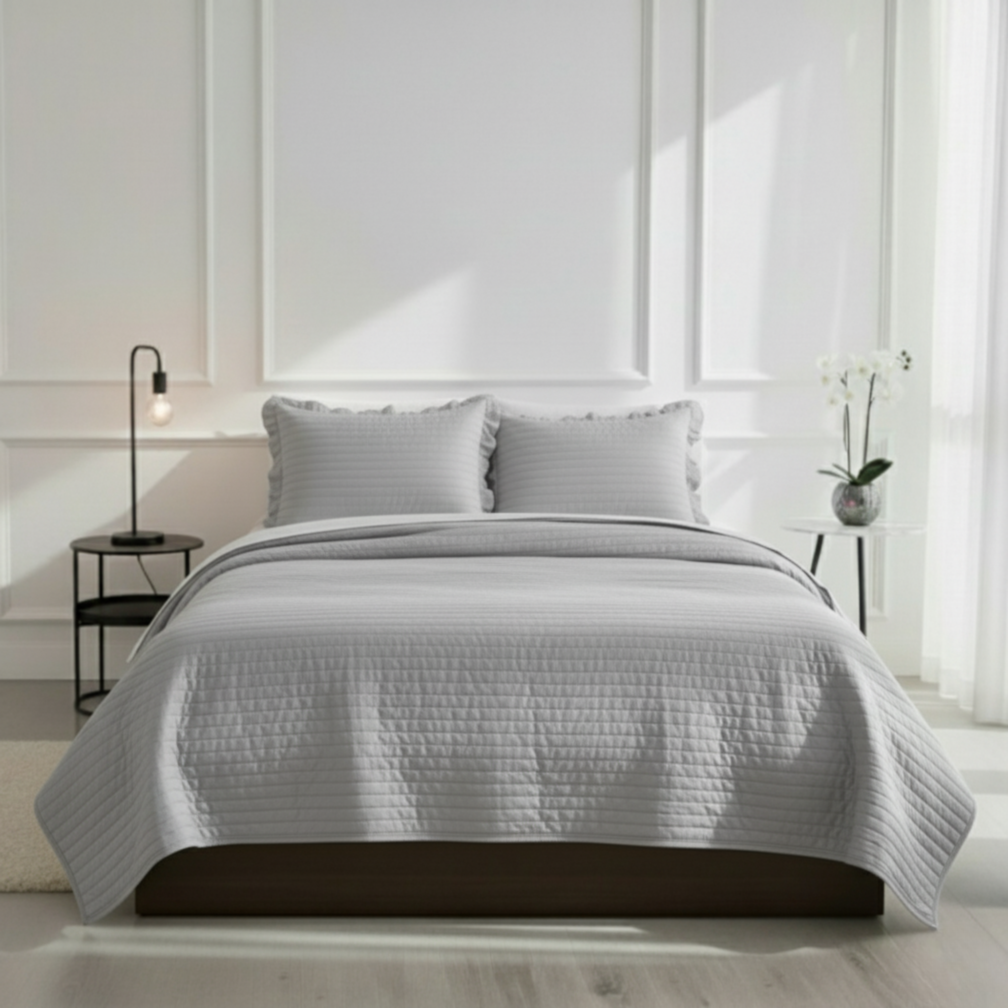Bring soft elegance and a relaxed, cozy charm to your space with this unique quilt set. It features a subtle channel-stitched pattern that adds refined texture and visual length to your bed. The quilt is finished with a beautiful ruffled flange edge, giving it a romantic, farmhouse-chic aesthetic. Perfectly lightweight for comfortable all-season layering or stand-alone use in warmer months. Enjoy the easy-care comfort of this stylish quilt, complete with two matching shams.