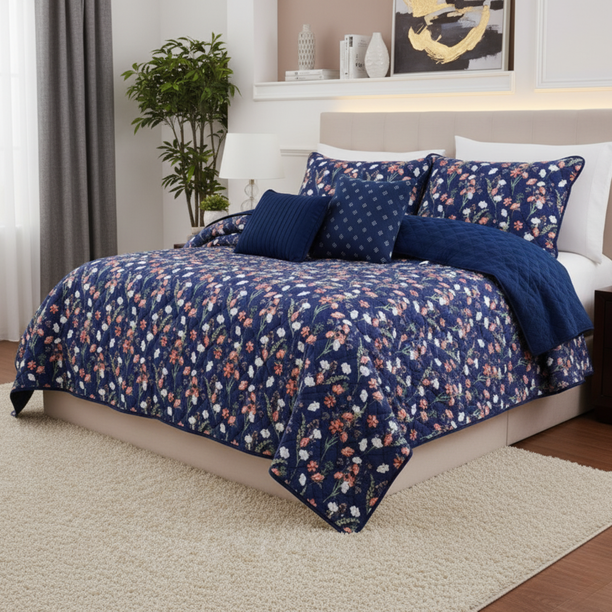 Elevate your bedroom with the soft, lived-in elegance of this complete 5-Piece Quilt Set. It features a pre-washed finish for exceptional, cozy comfort and timeless stitched quilting for lasting durability. The set includes one quilt, two matching pillow shams, and two decorative accent pillows, providing a full, layered look. This lightweight yet warm quilt layers beautifully for year-round comfort and style. Bring effortless luxury and a ready-made look to your space with this easy-care set.