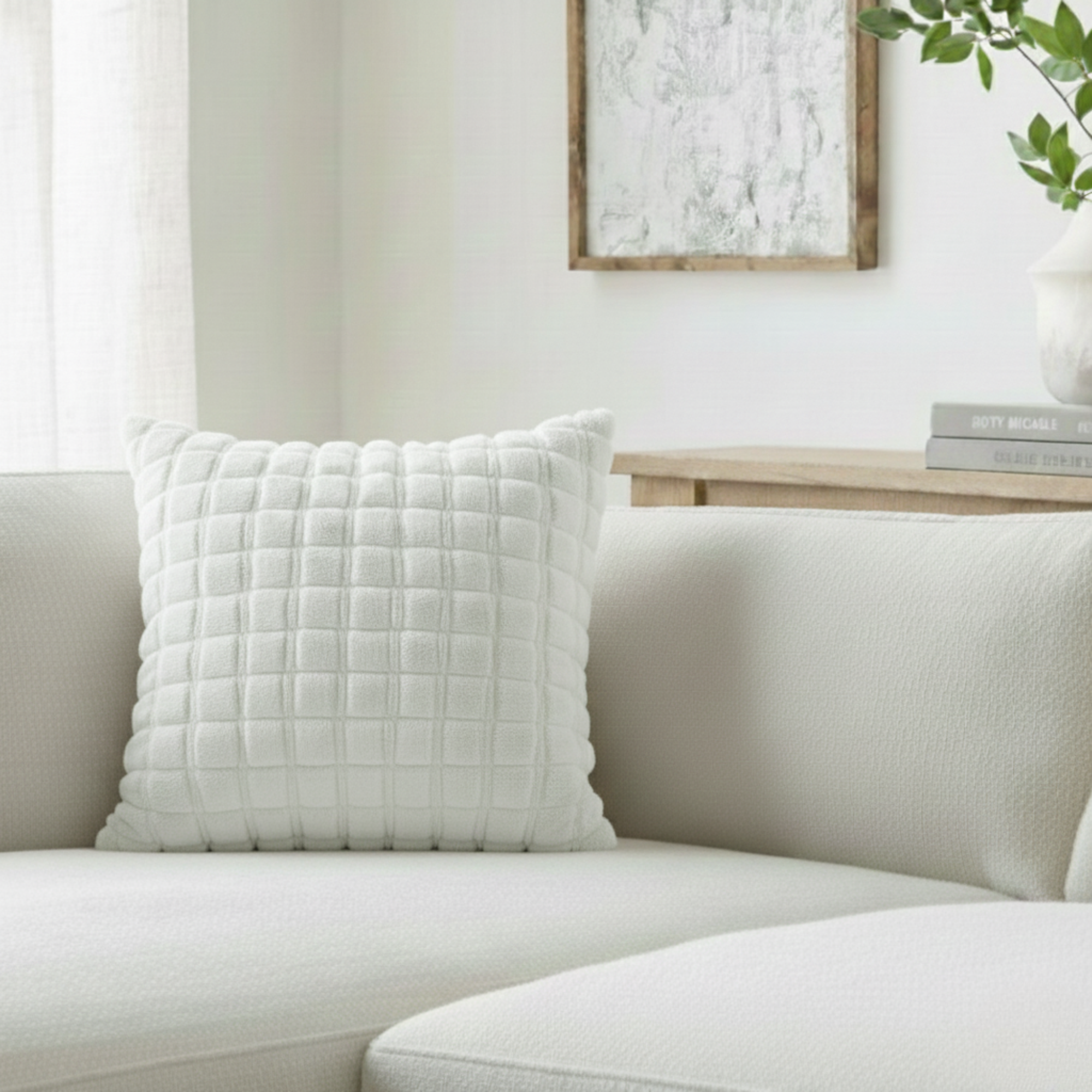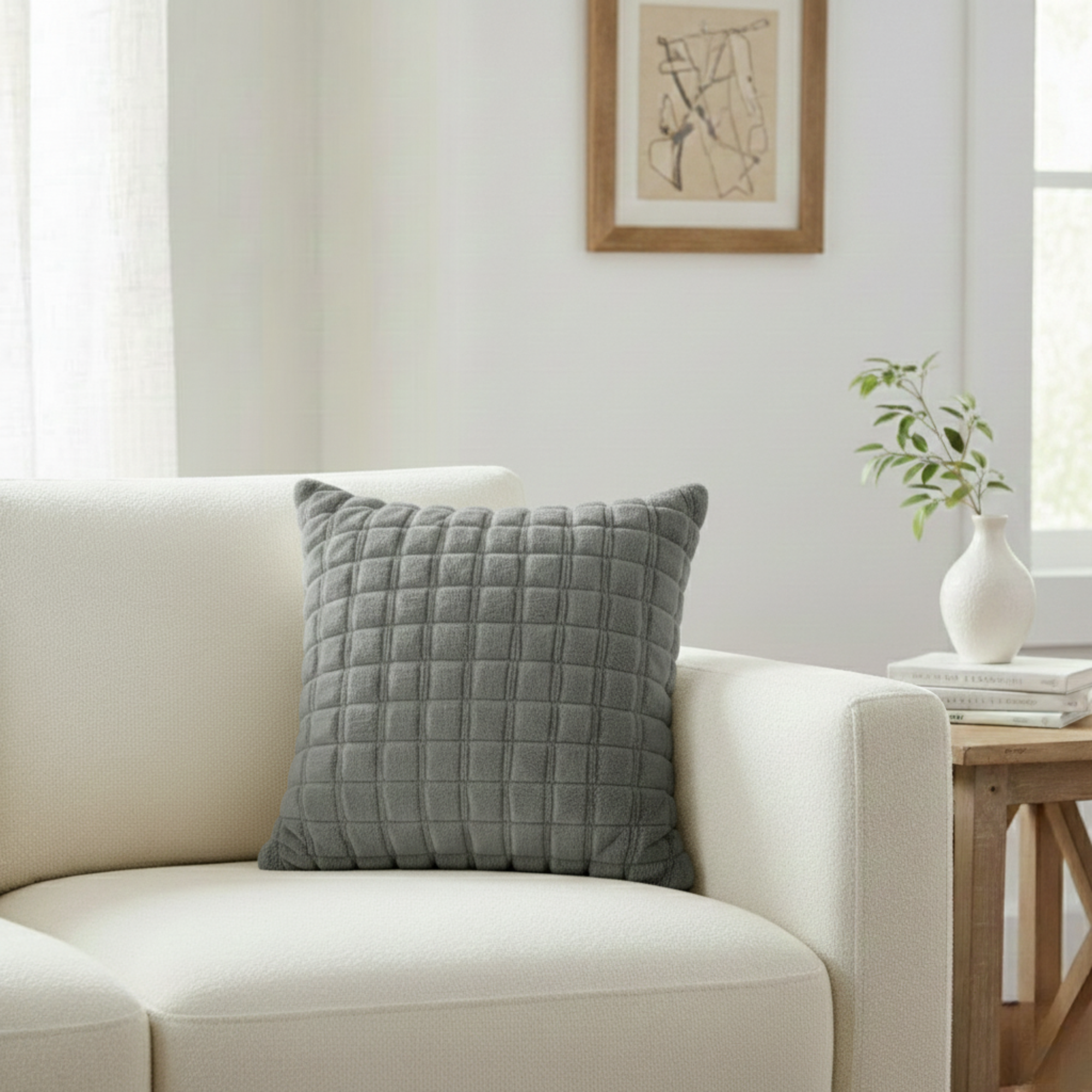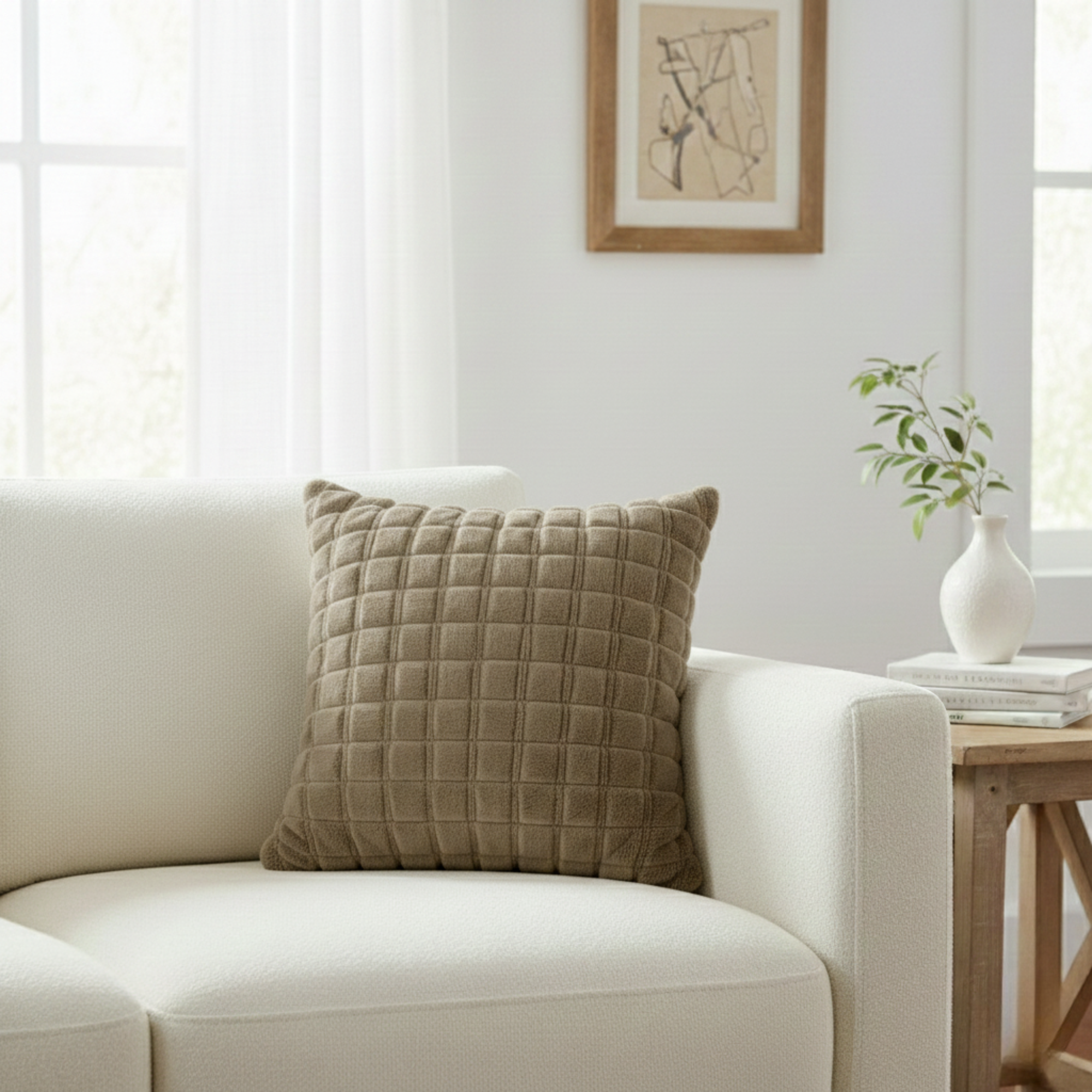Add depth, warmth, and cozy texture to your living room or bedroom with this chic Grid Textured Decorative Pillow. The neutral color and tactile surface make it an effortless accessory to layer into any contemporary or rustic setting.